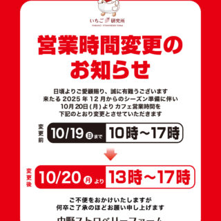 お知らせ 10月20日(月)より営業時間が変更となります 営業時間変更のお知らせ 平素より中野ストロベリーファームをご愛顧いただき誠にありがとうございます。 シーズン開始に伴う準備のため10月20日(月)よりカフェの営業時間を下記の通り変更させていただきます。 お客様には大変ご迷惑をおかけ... 2025.10.17 お知らせ営業日・時間