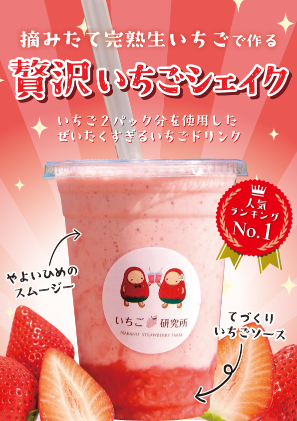 【復活】贅沢いちごシェイク お知らせ 2025.12.21 摘みたて完熟生いちごで作る「贅沢いちごシェイク」 シーズン中だけの限定商品摘みたて完熟生いちごで作る「贅沢いちごシェイク」新発売!生いちごをふんだんに使用したとてもフレッシュなシェイクに仕上がっています!是非ご賞味くださいませ♪